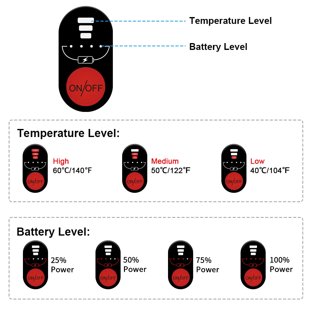 Effortlessly control your comfort levels with our user-friendly 3-step heating settings. By simply pressing the power button, you can activate the gloves in the high heat setting. Subsequent presses toggle through medium, low, and power-off modes. For optimal warmth throughout the day, begin with the high setting for the first 10-15 minutes and then switch to medium or low.